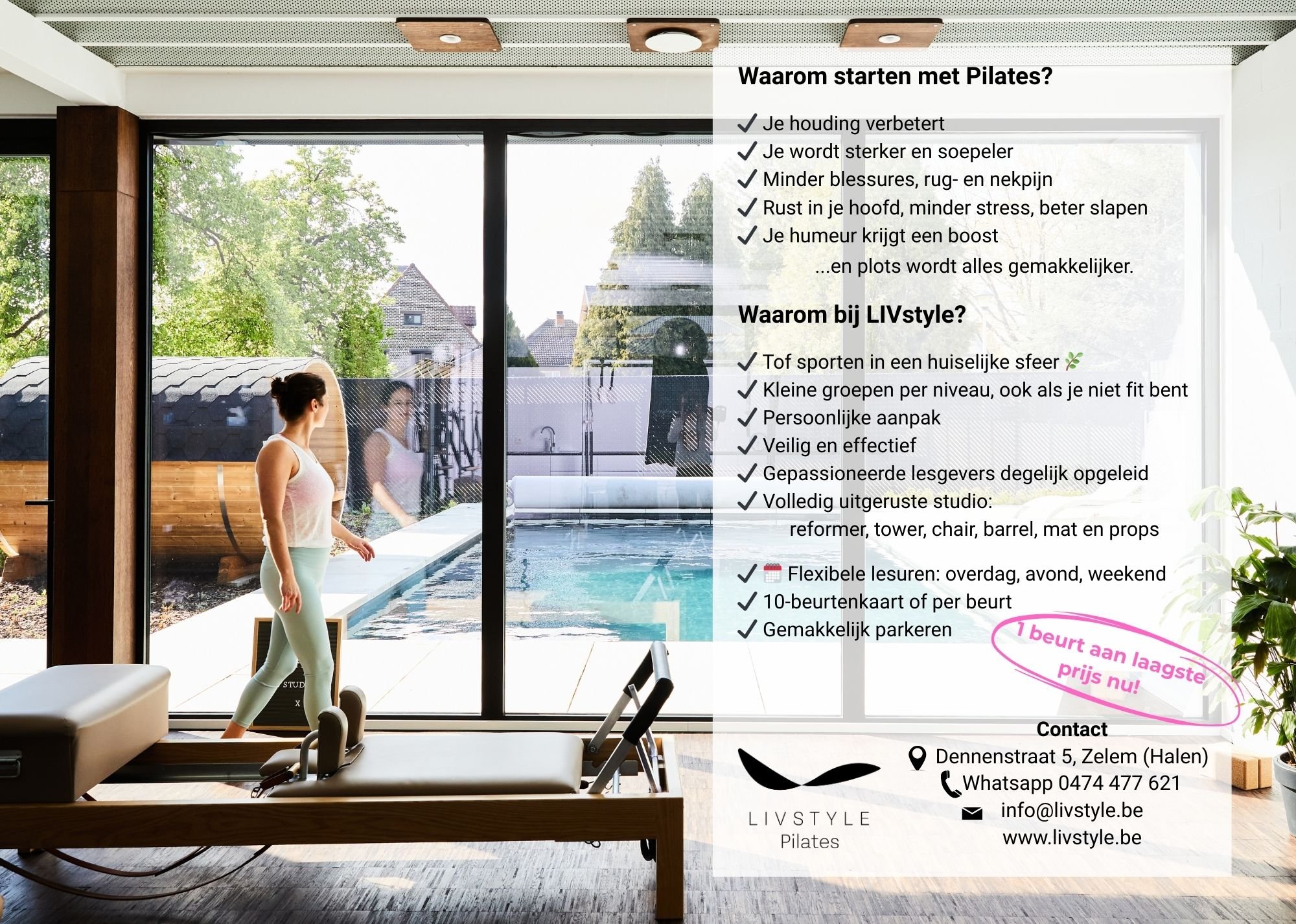 Als dertiger had ik een top corporate job in big pharma, ging in Limburg wonen, kreeg 2 kinderen en… ontdekte ik Pilates. Pilates hield me letterlijk en figuurlijk sterk tijdens deze intense periode. Dankzij Pilates verhoogde ik aanzienlijk mijn concentratievermogen en kon ik mijn stress beter kanaliseren. Ik was er zo door geïntrigeerd dat ik de 900h Comprehensive Studio Instructor Training volgde bij Kelly McKinnon van Corpus Pilates in Brussel. Verder trainde ik intensief bij Jeroen Vancoillie (Grace Pilates) en schoolde ik me bij met workshops van o.a. Xavier Velazquez (Pilates Rotterdam). Mijn doel was in de eerste plaats om de methode te leren kennen, maar al snel vond ik het fijn om mensen te helpen via deze bewegingsmethode en begon ik les te geven. In 2015 richtte ik LIVstyle Pilates studio op, eerst in Herk-de-Stad en later in Halen.